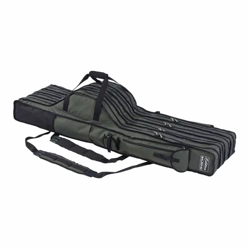 Extra dick gepolsterter Rutenrucksack. Die vier separaten Reißverschlusstaschen bieten Platz für vier montierte Ruten. In der Außentasche lässt sich bequem Schirm und Rutenhalter transportieren. Die gepolsterten Schultergurte ermöglichen, dass Sie die Tasche wie einen Rucksack tragen können. Der 1,70m Rutenrucksack verfügt über eine extra groß dimensionierte Ausbuchtung für Rollen. So können auch Surf- und Karpfenruten problemlos transportiert werden.