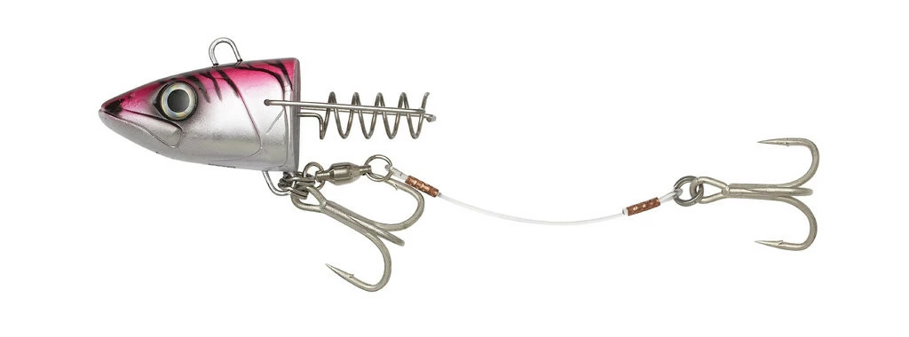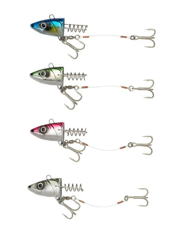Dies ist ein einfach zu bedienendes Ködersystem fu?r das Salzwasserangeln. Gefertigt aus hochwertigen Komponenten (einem starken Haken, einem starken Monostinger und einem bleifreien Kopf). Schrauben Sie den Köder auf (einfach Kopf entfernen und über die Mittelgräte aufdrehen – hält super), befestigen Sie ihn zusätzlich mit der Köderklammer und lassen Sie das System auf die Tiefe, in der die Fische fressen und fangen Sie! Einfach, innovativ und funktional. Es gibt dieses System in zwei Grammaturen von 200g und 300g, sowie vier verschiedenen Farben. Das Mono-Stinger hat eine Stärke von 1,20mm und die Drillinge eine Größe von 3/0 (200g) bzw. 4/0 (300g).