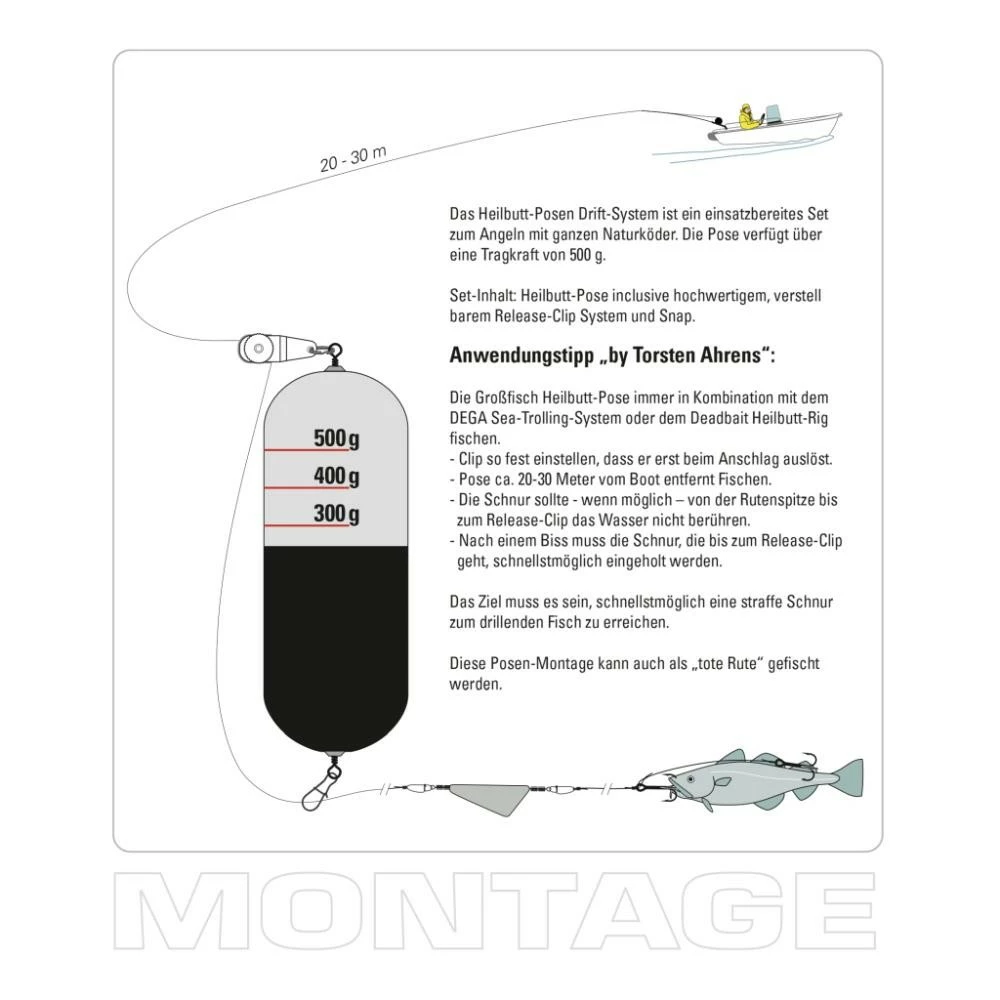 Anwendung: Die Großfisch Heilbutt-Pose immer in Kombination mit dem DEGA Sea-Trolling- System oder dem Deadbait Heilbutt-Rig fischen. Clip so fest einstellen, dass er erst beim Anschlag auslöst Pose ca. 20-30 Meter vom Boot entfernt fischen Die Schnur sollte – wenn möglich – von der Rutenspitze bis zum Release-Clip das Wasser nicht berühren Nach einem Biss muss die Schnur, die bis zum Release-Clip geht, schnellstmöglich eingeholt werden. Das Ziel muss es sein, schnellstmöglich eine straffe Schnur zum drillenden Fisch zu erreichen. Diese Posen-Montage kann auch als ,tote Rute” gefischt werden.