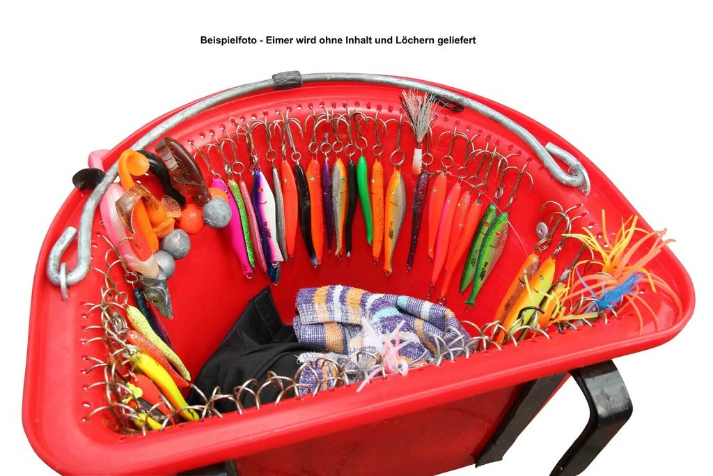 Dieser prkatische Eimer ist ideal für die Benutzung auf dem Boot. Er ist auf einer Seite abgeschräkt und besitzt an dieser Halterung, um den Eimer an der Reling zu befestigen. Man diesen Eimer auch prima zum Transport und zur Aufbewahrung von Pilkern und Zubehör benutzen. Dazu müssen nur ein paar Löcher in der Rand gebohrt werden. Der Eimer besteht aus robusten Polypropylen und hat ein Fassungsvermögen von 14l.