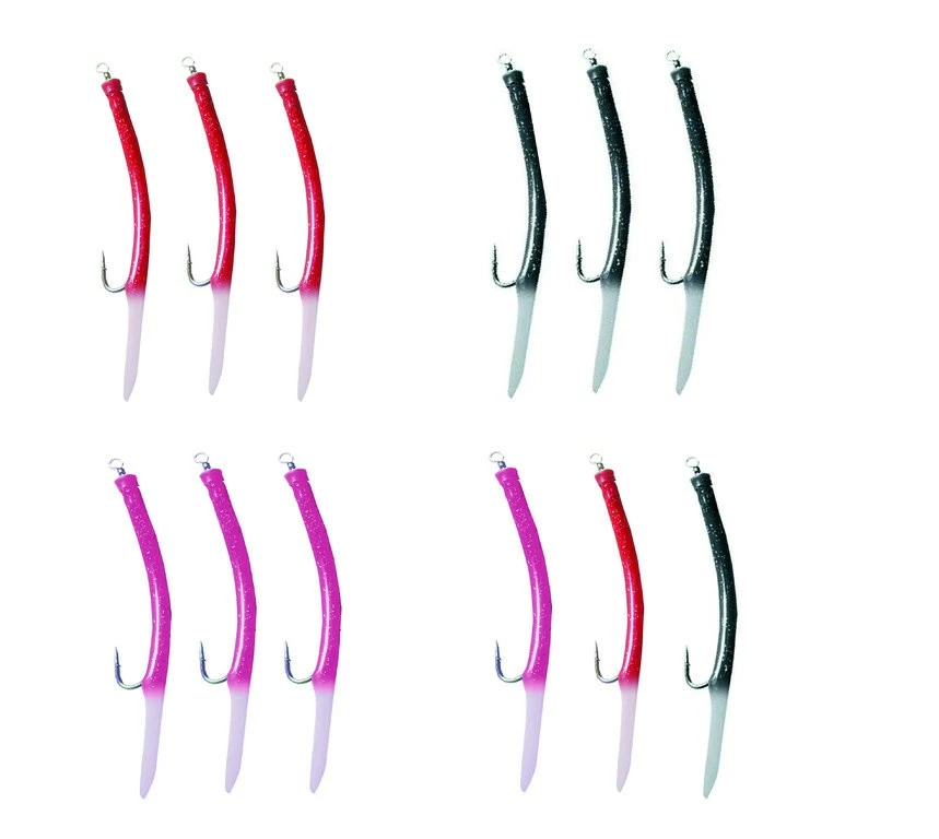 Diese selbstleuchtenden Gummi-Makks besitzen stabile Makk-Haken. Der Leuchtschlauch überzieht diesen gebogenen Haken und ist mit einem Karabiner-Wirbel bestückt. Die Makk sind zweifarbig mit Glitter und einem Leuchtende. Es gibt diese Makks in drei Farben und einen Mix. Die Hakengrößen reichen von 4/0 bis 12/0. In jeder Packung sind 3 gleichfarbige Makks enthalten (außer 12/0 – 2 Stück). Beim Mix ist von jeder Farbe ein Makk enthalten (außer 12/0 – 1x Schwarz + 1x Rot).