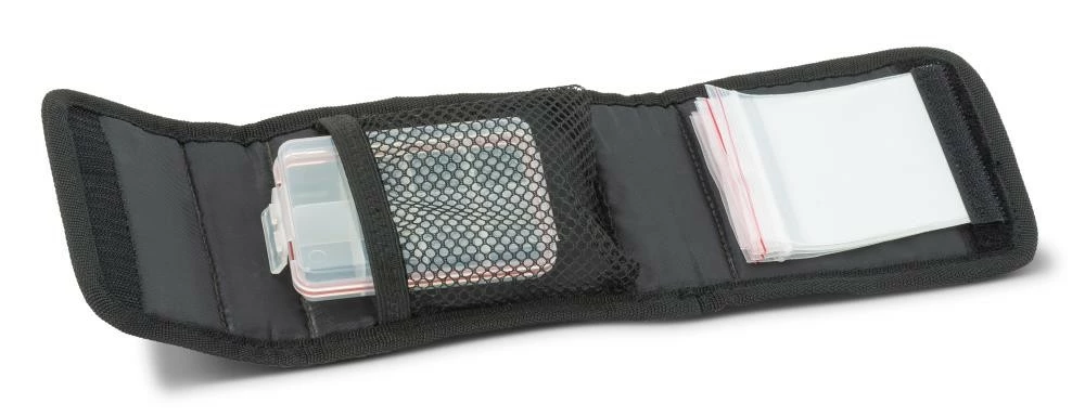 Zweckmäßiges Wallet zur Aufnahme von z.B. Spinnvorfächern. Auf einer Seite mit 5 Klarsichthüllen ausgestattet und inkl. einer Box, welche sich durch ihre Unterteilung hervorragend dazu eignet, Kleinteile wie Wirbel, Quetschhülsen etc. aufzunehmen.