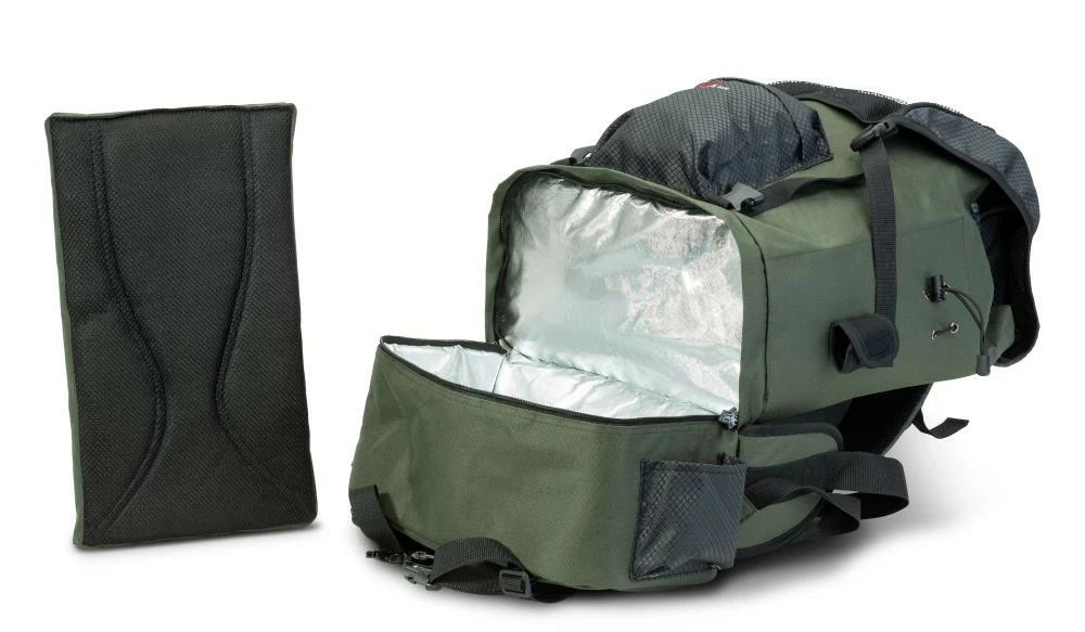 Der perfekte Rucksack für Ihren Raubfischangeltag am Wasser! Bei dem überaus großen Hauptfach bekommt der moderne Raubfischangler alles transportiert, was nötig ist um sicher zum Erfolg zu gelangen. Der Rückenbereich wurde mit einer rücken- und nierenschonenden Polsterung, welche herausklettbar und auch als Sitzkissen verwendbar ist, versehen um angenehmen Tragekomfort zu garantieren. An eine Fixierung durch einen Brustgurt wurde außerdem gedacht. Stabilität bekommt der Rucksack durch ein eingearbeitetes, ultraleichtes Aluminiumgestell. Im unteren Teil ist ein Kühlfach integriert. Auf der linken und rechten Seite sind jeweils Vorrichtungen zum Transport von Ruten und Keschern, ideal auch wenn man mit dem Fahrrad unterwegs sein sollte.