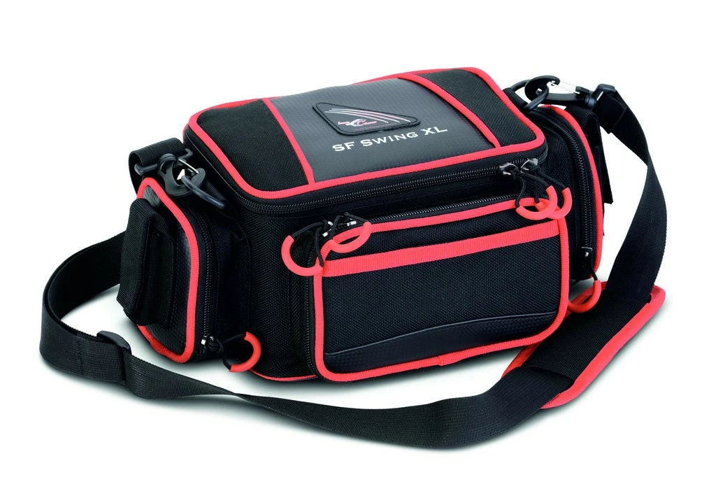 Die SF Swing XL ist der ideale Begleiter für Uferangler welche große Strecken am Wasser zurücklegen. Trotz des kompakten Maßes bietet die Tasche viel Stauraum für alle benötigten Utensilien. Die Reißverschlüsse sind mit extra stabilen Schlaufen versehen welche selbst mit Handschuhen oder nassen Händen ein leichtes öffnen und schließen ermöglichen. Außerdem sind die Befestigungen des Tragegurtes versetzt angeordnet. Dies ermöglicht ein bequemes tragen und die Tasche kann einfach zum Köderwechsel vor dem Bauch getragen werden. Natürlich ist auch diese Tasche mit einem Zangenhalter für schnellen Zugriff ausgestattet.