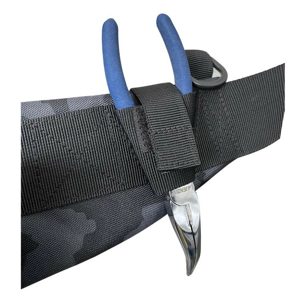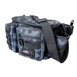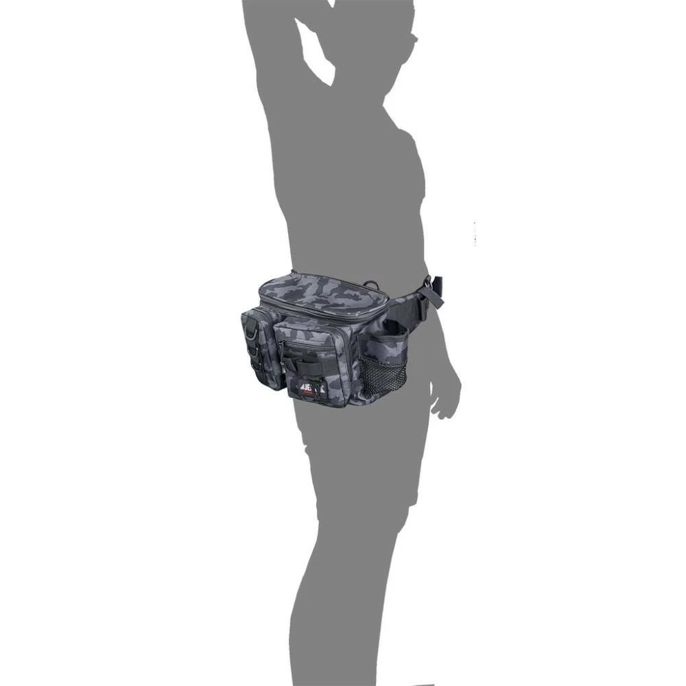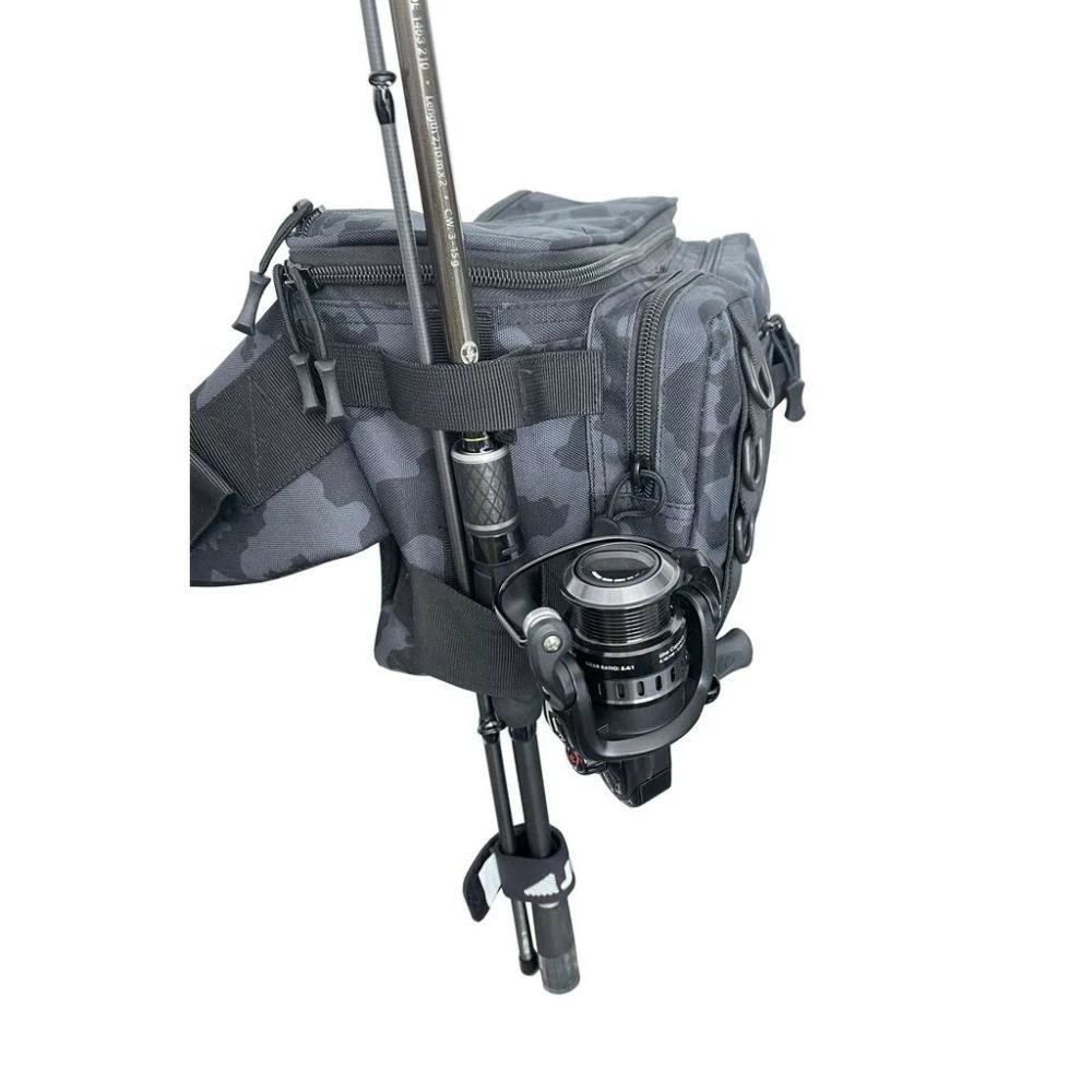 Diese Camou Hip Bag (Bauchtasche) verfügt insgesamt über 5 Reißverschlussfächer. Im oberen Hauptfach bietet die Bauchtasche genügend Platz für zwei große Plastikboxen, welche im Lieferumfang enthalten sind. Seitlich befindet sich eine Getränketasche sowie eine Halterung zum Transport einer montierten Rute sowie einer Zange. Zusätzlich wurden mehrere Clips und Karabiner zur Befestigung von weiterem Zubehör angebracht. Das Material ist wasserabweisend und sehr strapazierfähig.