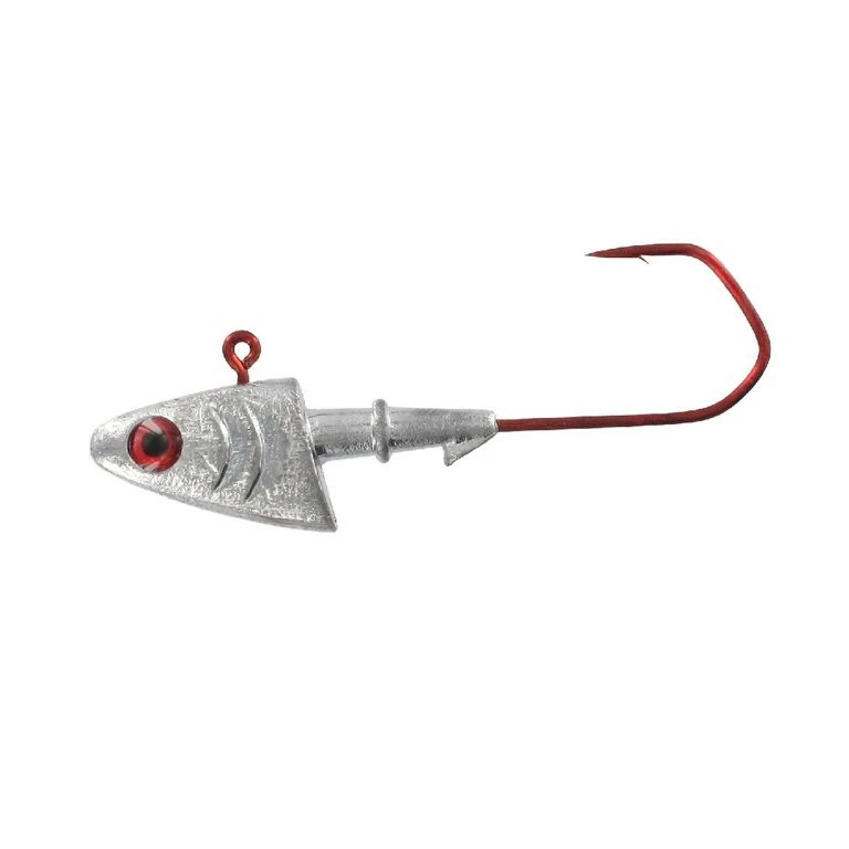 Dieser Jigkopf als Fischkopfimitat mit roten Augen und Kiemen ist in zwei Hakengrößen verfügbar. Die Gewichte reichen von 40g bis 140g.