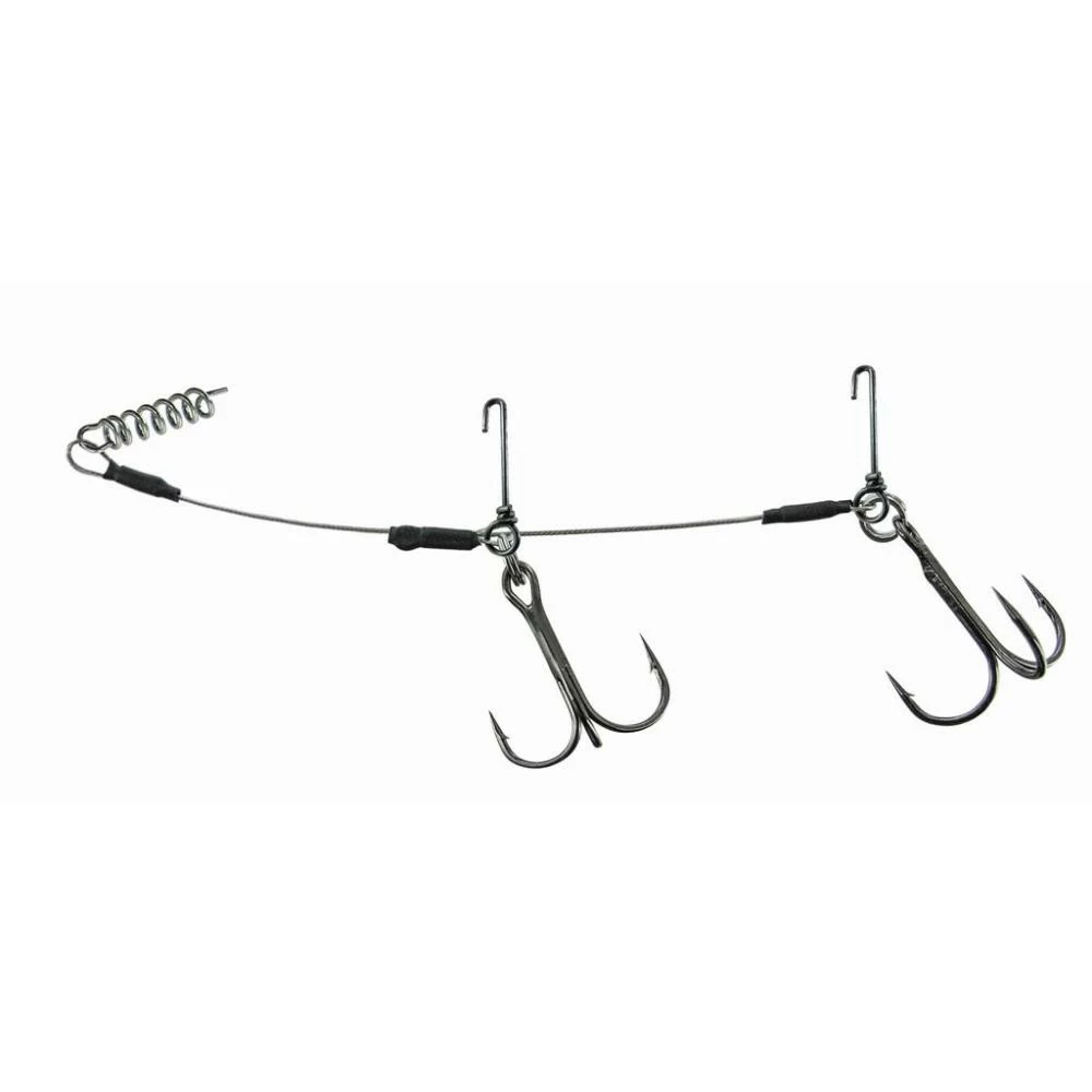 Der einfachste Weg einen Gummifisch ohne Bleikopf zu montieren – oder einen Bleikopf später davorschalten. Die Spirale wird in den Gummifisch oder auch Köderfisch geschraubt, die Haken mittels Metallstifte im Köder fixiert und das Angeln kann beginnen. Die Haken bleiben hierbei frei hängend unter dem Köder, was Fehlbisse auf ein Minimum reduziert.