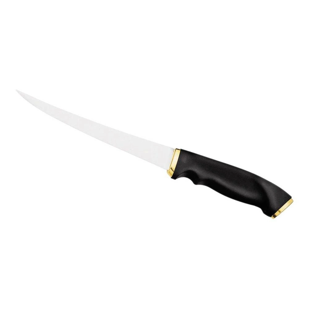 Das original finnische Filetiermesser von Marttiini hat eine scharfe, flexibel geschliffene Klinge aus rostfreiem Edelstahl. Die Klinge ist durch ein patentiertes Befestigungssystem ohne sichtbare Nieten fest im Griff fixiert. Der schwarze Gummigriff mit Fingermulden liegt rutschfest in der Hand. Die massive Messingplatte am Heftende sorgt für eine besondere Note. Die Lieferung erfolgt inklusive Lederscheide mit Kunststoffeinlage als Durchstechschutz.