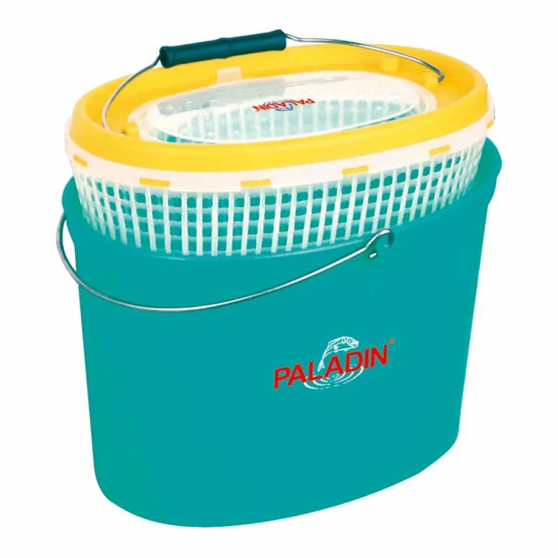 Köderfischeimer mit herausnehmbarem Einsatz zur schnellen Entnahme und unkompliziertem Wasserwechsel. Der feste Deckel verhindert ein zu leichtes Überschwappen. Durch die separate Klappe lässt sich der Köder entnehmen, ohne den Einsatz hochzuheben.