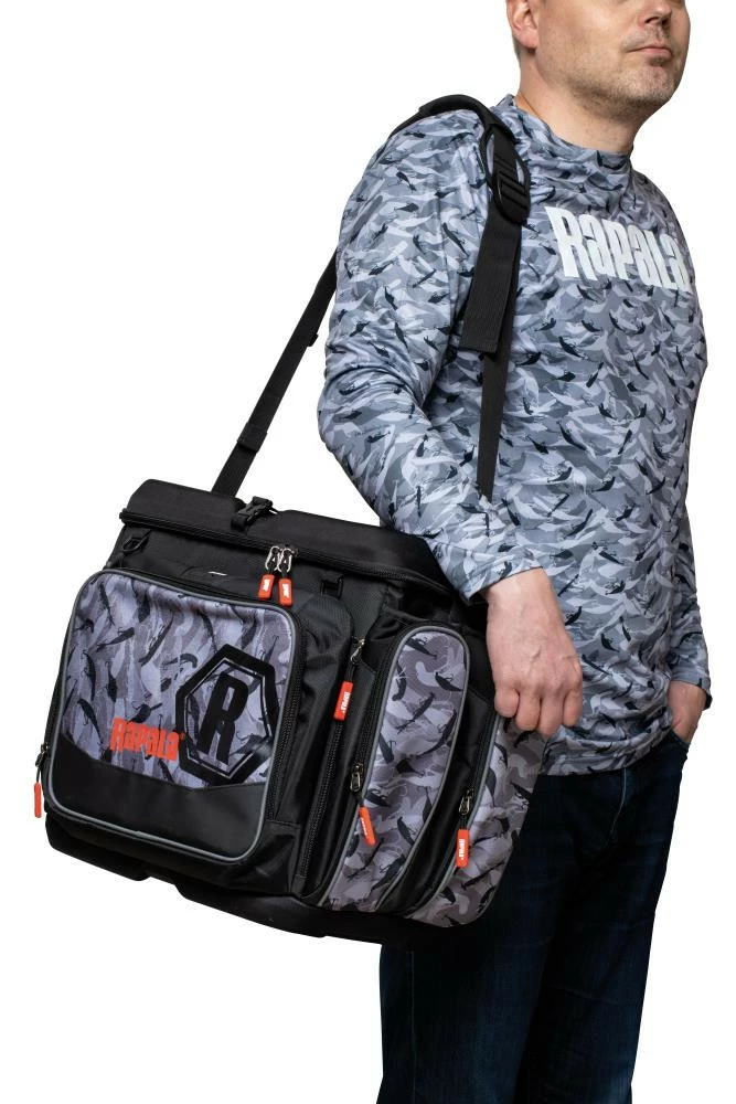 Wasserdichtes Rapala Gewebe im LureCamo-Design und einem geformtem, wasserdichtem EVA-Boden und -Deckel, um das Eindringen voon Wasser zu verhindern. Die Tasche biedet Platz für sieben Tackle-Boxen der Größe 3700 im Inneren der Tasche und eine Achte für schnellen Zugriff auf der Oberseite. Die mehrlagige Fronttasche bietet sicheren Stauraum für Werkzeug, das sich für einen einfachen Zugriff weit öffnen lässt, sowie Reißverschlusstaschen für Vorfächer und Organizer. Weiter besitzt sie D-Ring-Befestigungspunkte auf der Vorderseite, durchsichtige Tasche mit Reißverschluss im Deckel., Neopreneinsätze an den Seitentaschen für zusätzliches Fassungsvermögen, sowie Endtaschen, die auch als Rutenhalter dienen. Sie hat einen gepolsterten, verstellbarer Schultergurt, der zu einem Tragegriff heruntergezogen werden kann.
