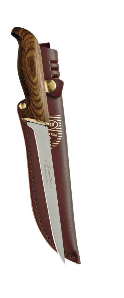 Ein moderner Klassiker dank überholten Nordic-Designs. Brau laminierter Griff mit polierter Edelstahlklinge oder mit grau laminierten Handteil mit PTFE-beschichteter Klinge. Verstaut wird das Messer in einer abgestimmten Echtlederscheide mit Druckknopfverschluss. Die Klinge ist progressiv verjüngt. Für doe volle Kraftausübung besitzt das Messer einen durchgehenden Erl.