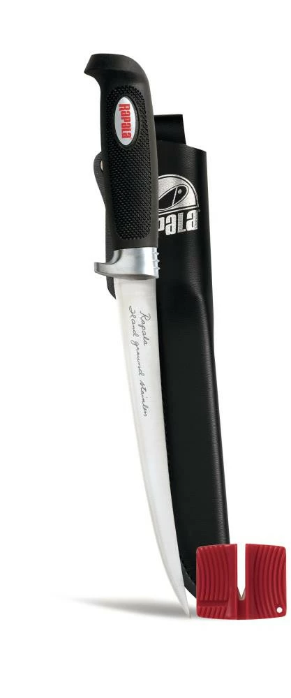 Dieses Set besteht aus einem Filetiermesser, einer Messerscheide und einem Messerschärfer. Die Lieferung erfolgt in einem Blister. Das Messer beistzt die berühmte flexible Klinge von Rapala mit rutschfestem, weichem Griff für bequemes Filetieren. Der vergrößerte Fingerschutz sorgt für zusätzliche Sicherheit. Es kommt komplett mit koordinierter schwarzer Strukturscheide und einem einstufigen Schärfgerät.