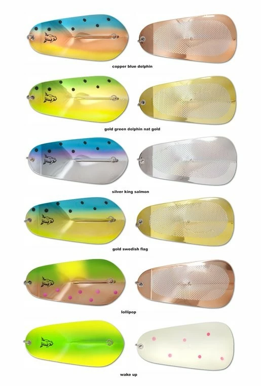 Der K1 Flasher kann sowohl ruhig als auch schnell geschleppt werden, sein idealer Einsatzbereich liegt zwischen 1,2 und 2,6 Knoten. Durch seine kreisenden Bewegungen, die er im Ganzen als auch um seine eigene Achse vollführt, ist er ein echter Hingucker für Lachs und Co. Ein Bewegungsmuster, das die Fische so noch nicht kennen, wird ihre Aufmerksamkeit gezielt auf den dahinter laufenden Köder lenken. Durch seine relativ großen Kreisbewegungen sollte der K1 Flasher nicht zu weit nach hinten ausgebracht werden. Als Abstand vom Köder zum Flasher empfehlen wir zwischen 0,70 bis 1,40 Metern. Einzusetzen mit Natur- und Kunstködern. Der Flasher hat eine Länge von ca. 20cm und ein Gewicht von 55g. Er ist in sechs fantstischen Farben verfügbar. Die Rückseite der Flasher ist abhänig von der Flasherfarbe.