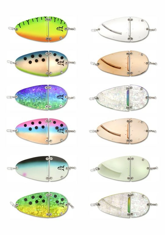 Der K2 Flasher ist der erste zweiteilige Flasher aus dem Hause Rhino. Sein verlockender Lauf wird Blinker- und Naturköderangler gleichermaßen begeistern. Durch seine seitlichen Ausbrüche, gepaart mit unregelmäßigen Drehungen, hat dieser Flasher schon in der Probephase gezeigt, dass er Lachse, Meerforellen und Dorsche zu betören weis. Durch seine einzigartige Bauform macht dieser Flasher im Drill so wenig Druck, dass man das Gefühl hat, man drillt die Fische an der freien Schnur. Ein wahres Drillvergnügen ist sicher. Dieser Flasher ist in sechs verschiedenen Farben verfügbar, wobei die Rückseite abhänig von der Farbe gefärbt ist. Der Flasher ist in einer Länge von 12,5cm oder 18cm verfügbar. Dabei hat er ein Gewicht von 21g bzw. 53g.