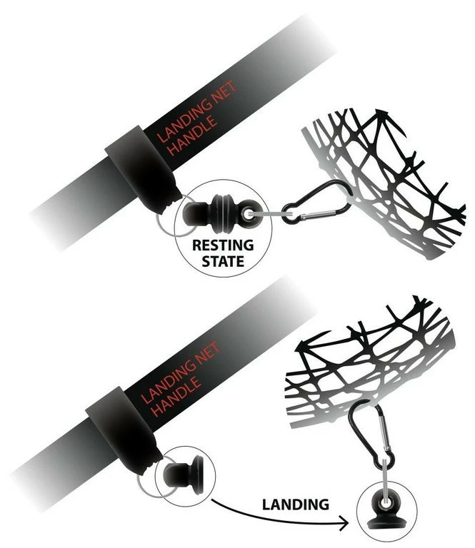 Zum Nachrüsten an Keschern mit großem Netzsack. Mittels des Magnet-Netzhalters liegt das Netz bis zu seinem Einsatz am Kescherstab an und so besteht keine Gefahr, dass sich das Netz beim Hantieren mit dem Kescher irgendwo verfängt. Durch das Gewicht des Fisches löst der Magnet aus und die Beute liegt sicher im tiefen Netzsack.Die eine Seite des Magnetic Net Releases wird mittels eines Sprengrings am tiefsten Punkt des Netzes befestigt, die andere mittels des Klettbandes stramm am Kescherstab. Auf jede Keschergröße einstellbar.