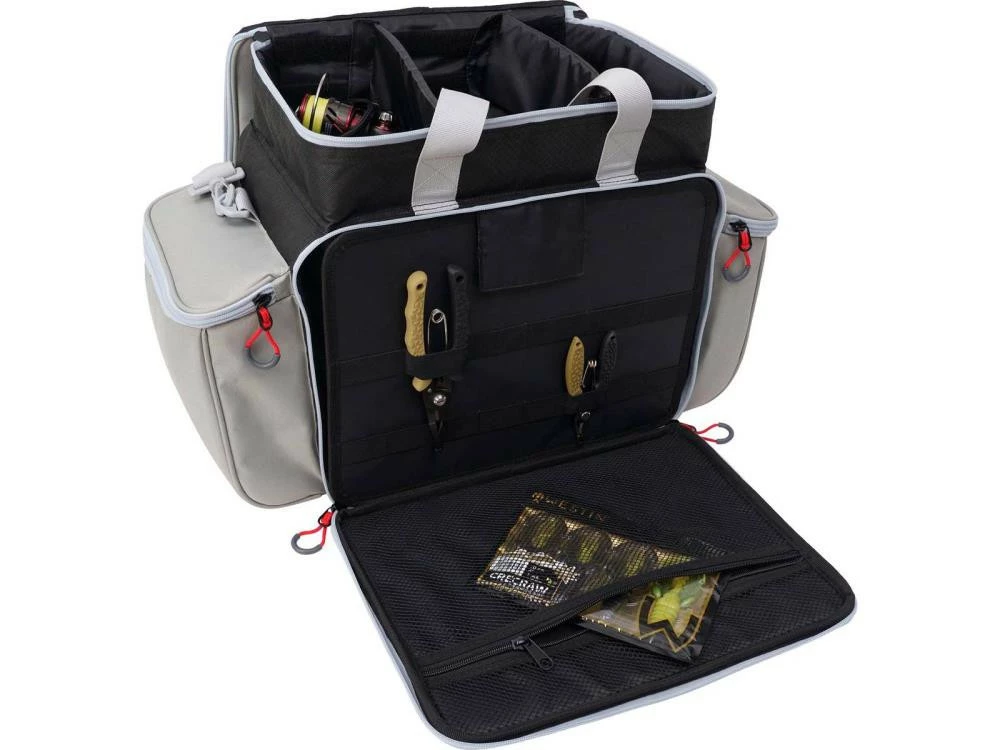 Die W3 Vertical Master Bag ist die perfekte Lösung, um alles in schöner Ordnung zu halten. Das Hauptfach enthält Köderboxen und an der Vorderseite findest Du eine Werkzeug-Organisationsplatte, um Deine Tools aufzubewahren. Das obere Fach hat zwei abnehmbare und verstellbare Trennwände. Die W3 Vertical Master Bag hat große Netztaschen, große Seitentaschen für Zubehör, Tragegriffe und einen abnehmbaren, gepolsterten Schultergurt.